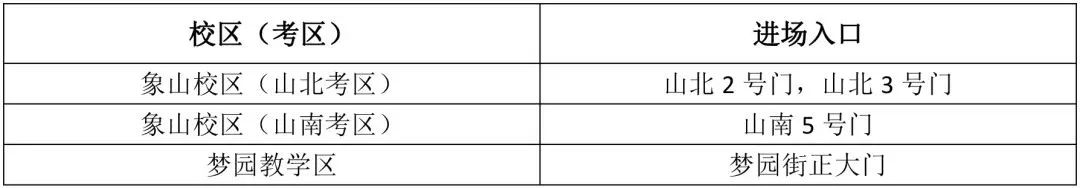 考試正式開始時(shí)間為上午8:30、下午13:30。造型藝術(shù)類專業(yè)考試結(jié)束時(shí)間下午17:50,其他各專業(yè)考試結(jié)束時(shí)間下午17:20 。二、考生進(jìn)場(chǎng)與考場(chǎng)分布考生需根據(jù)準(zhǔn)考證顯示的考場(chǎng)信息,關(guān)注周邊交通情況,合理規(guī)劃赴考路線,提前45分鐘以上到校參加考試。進(jìn)場(chǎng)入口請(qǐng)參照下表:1、考生考前需認(rèn)真閱讀《中國(guó)美術(shù)學(xué)院本科招生專業(yè)考試考場(chǎng)規(guī)則》(詳見附件1)遵守考場(chǎng)紀(jì)律,服從監(jiān)考人員指揮。2、考生憑準(zhǔn)考證和二代身份證原件參加考試,考生只許攜帶考試需用的有關(guān)文具、畫板(畫架)進(jìn)入考場(chǎng)。考生不得攜帶任何書籍、畫冊(cè)、資料、稿紙、帶圖文數(shù)字模板的功能尺、色卡和通訊工具或有存儲(chǔ)、查詢功能的電子用品(含手機(jī)、相機(jī)、智能手表)。畫板(畫架)上不準(zhǔn)粘貼各種圖案。3、開考15分鐘后遲到考生不得進(jìn)入考場(chǎng);考試期間不得提前交卷離場(chǎng)。4、考生領(lǐng)取試卷后須仔細(xì)核對(duì)試卷粘貼的條形碼號(hào)是否與準(zhǔn)考證號(hào)一致,考生若遇試卷、試題分發(fā)錯(cuò)誤、印刷字跡不清,可舉手向監(jiān)考人員詢問。涉及試題內(nèi)容的疑問,不得向監(jiān)考人員詢問。5、考試終了時(shí)間一到,考生應(yīng)立即停筆,所有試卷、試題和草稿不得帶離考場(chǎng),否則按作弊處理。6、考試不得使用定畫液(建議自帶鋰電池吹風(fēng)機(jī))。1、考生在考試期間須全程佩戴口罩。2、學(xué)校不提供餐飲服務(wù),考生需自備干糧。3、未盡事宜請(qǐng)咨詢招生辦:0571-87164630。中國(guó)美術(shù)學(xué)院招生辦2023年2月18日1、《中國(guó)美術(shù)學(xué)院本科招生專業(yè)考試考場(chǎng)規(guī)則》