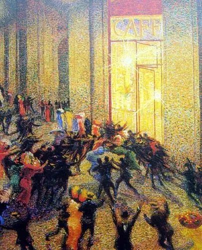 未來主義主張與傳統(tǒng)文藝徹底決裂,“火燒圖書館、水淹博物館、掩埋遺跡、拋棄一切已有的文明成果”,未來主義對傳統(tǒng)藝術(shù)的憎惡,超過以往的任何流派,可以說是激進得極端。認(rèn)為速度和力量就是美,贊美機械運動。繪畫常見題材是機器,包括汽車、有軌電車和火車,也有表現(xiàn)人或動物同時性運動的題材