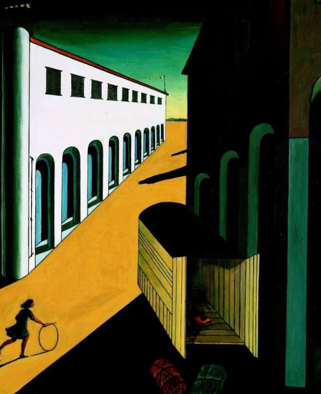 形而上派著力表現(xiàn)西方社會的病態(tài)而對科技進步持懷疑態(tài)度。如同它的名字,這個畫派深受叔本華和尼采唯心主義的影響,但其中帶有更多的弗洛伊德思想的影響,事實上他們比后來的超現(xiàn)實主義畫派更早的體現(xiàn)了精神分析學(xué)中關(guān)于直覺、幻覺和潛意識的應(yīng)用,作品中充滿了神秘怪異的氣氛,描繪的多為物體的穩(wěn)固、無時間性和不朽性。