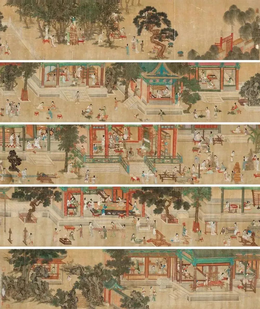 《漢宮春曉圖》以人物長(zhǎng)卷畫,生動(dòng)地再現(xiàn)了漢代宮女的生活情景。其畫題即高度概括了繪畫的題材與內(nèi)容:鼎盛與繁華象征的“漢宮”,引人產(chǎn)生無限遐想的“春曉”。在這里,仇英以春日晨曦中的漢人宮廷為題,描繪了宮廷仕女生活的場(chǎng)景,表達(dá)了他對(duì)宮廷浮華美好生活的贊美。