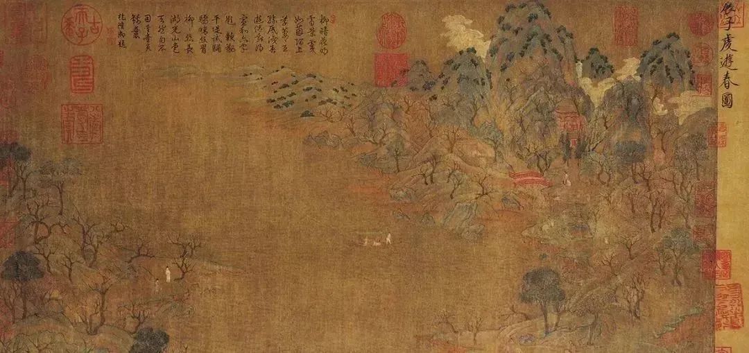 該圖以全景方式描繪了廣闊的山水場(chǎng)景,圖中除描繪了山水樹石外,還描繪了白云出岫,雜以樓閣、院落、橋梁、舟揖,并點(diǎn)綴著踏春賞玩的人物車馬,展示出一幅杏桃綻開、綠草如茵、水波粼粼,春風(fēng)蕩漾的春日融融之景象。