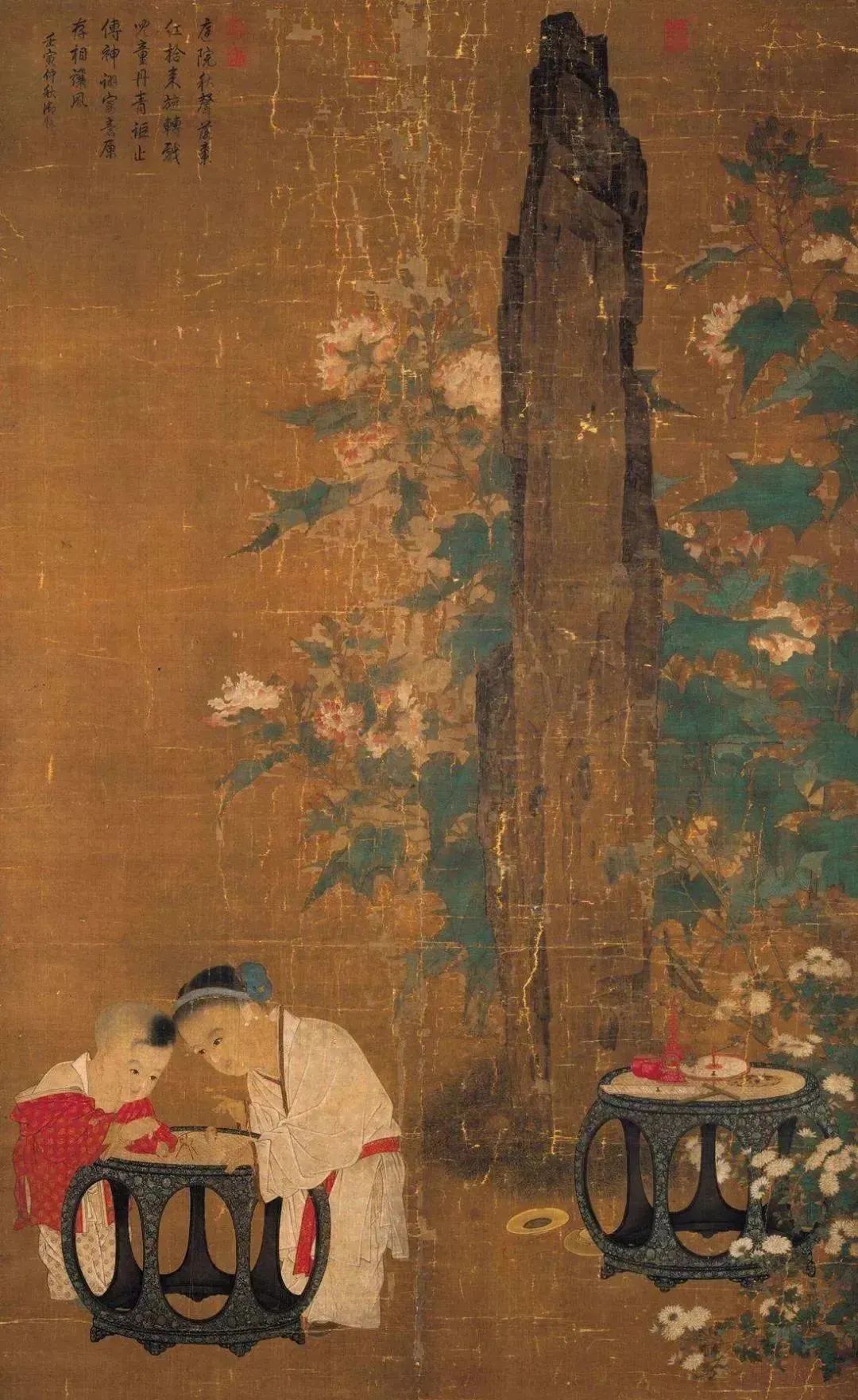 《秋庭戲嬰圖》以細(xì)膩的筆法,描繪兩個(gè)錦衣孩童在庭院玩著一種推棗磨的游戲。兄妹兩人無論從頭發(fā)、眉目,衣飾,都精心刻畫,絲染兼?zhèn)?,而且變化極為豐富,以長(zhǎng)而圓潤(rùn)的線條,畫出衣紋,再仔細(xì)點(diǎn)染衣服上的花紋,不僅畫出質(zhì)料的柔軟細(xì)致,更賦予衣服華麗的質(zhì)感,這些細(xì)微的處理,使得子孩豐潤(rùn)、柔軟、細(xì)致的模樣,躍然于紙上。