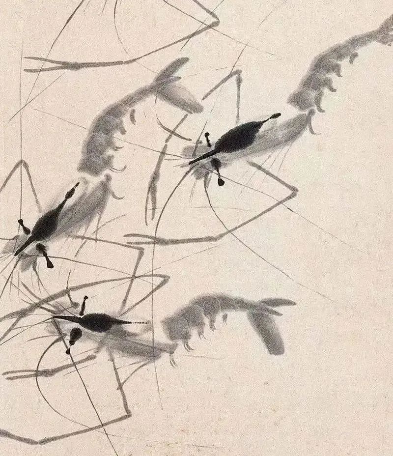 齊白石蝦圖,體現(xiàn)了高度的筆墨技巧,在表現(xiàn)了水墨、宣紙的獨(dú)物性能外,又將蝦之質(zhì)感表現(xiàn)得淋漓盡致, 是白石筆下最寫實(shí)的對(duì)象之一。