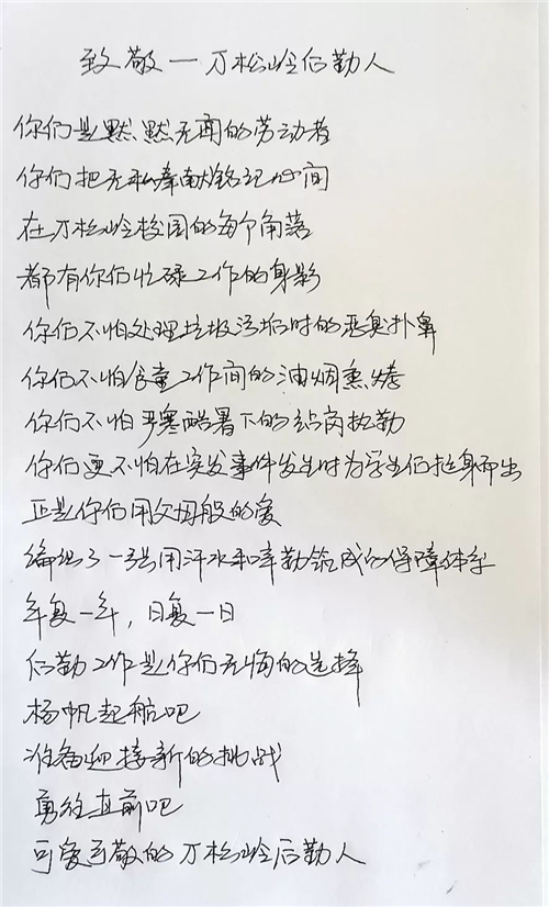 后勤人擁有著淳樸的笑容、樸實(shí)的話語(yǔ)和溫馨細(xì)致的實(shí)際行動(dòng),后勤人正在用自己的溫情付出詮釋著萬(wàn)松嶺對(duì)學(xué)生的愛(ài)與關(guān)懷。